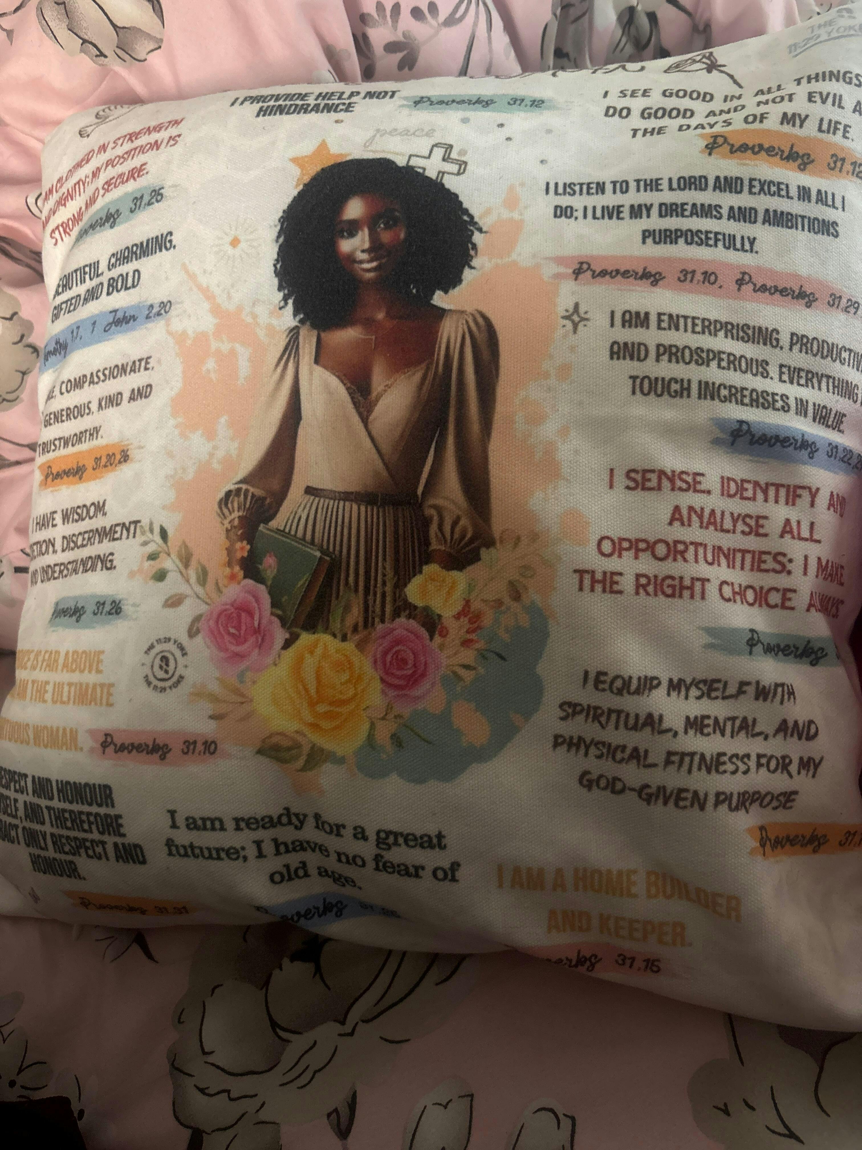 Very good quality from both the pillow and the tea cup .Thank you for this wonderful initiative.My Proverbs 21 pillow always reminds me of my capabilities and strengths.My tea cup reminds of Gods word always.Thank you